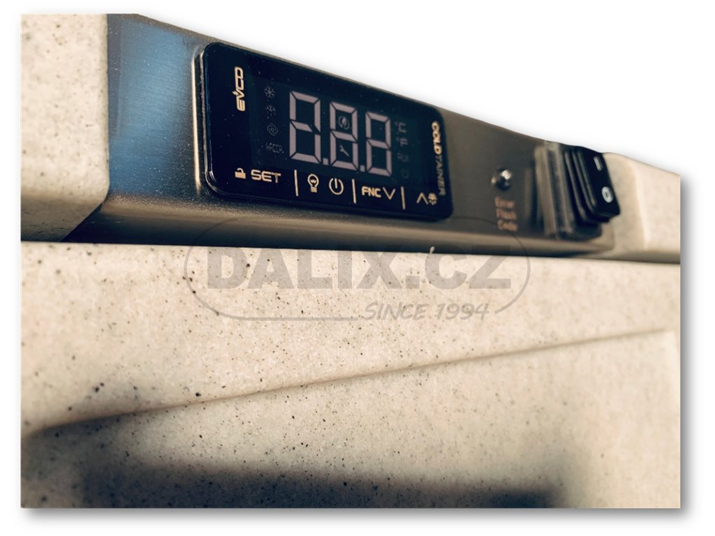 - Box je osazen hermeticky uzavřeným kompresorem Danfoss BD220CL s integrovanou řídící jednotkou a ochranou baterie proti vybití. Digitálním termostatem lze variabilně nastavovat a sledovat teplotu uvnitř boxu.
