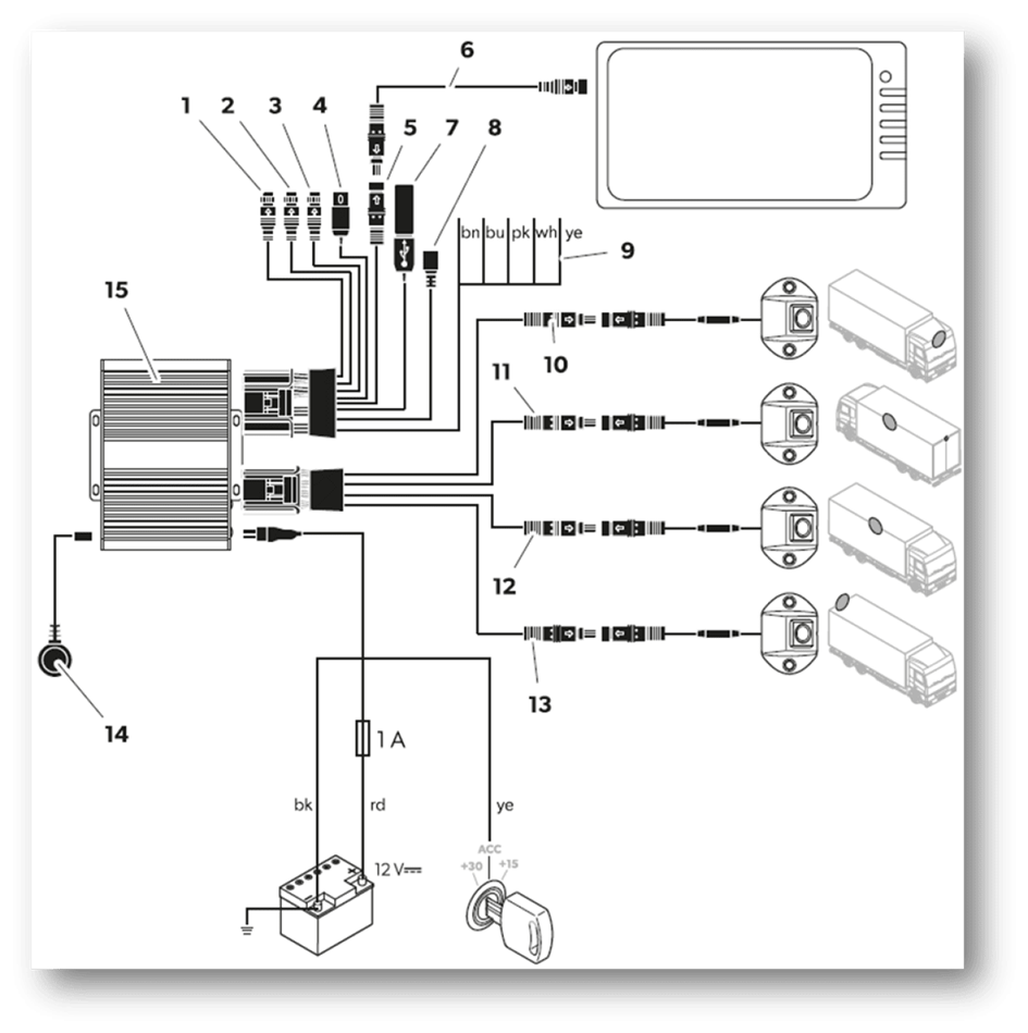 Systém obsahující 4 kamery je nutno doplnit o monitor, kabelový kit pro připojení kamer 1 x 5 m na přední kameru, 2 x 10 m na boční kamery a 1 x 20 m na zadní kameru a kalibrační podložky, neboť celý systém je nutné následně zkalibrovat (součástí návodu).
