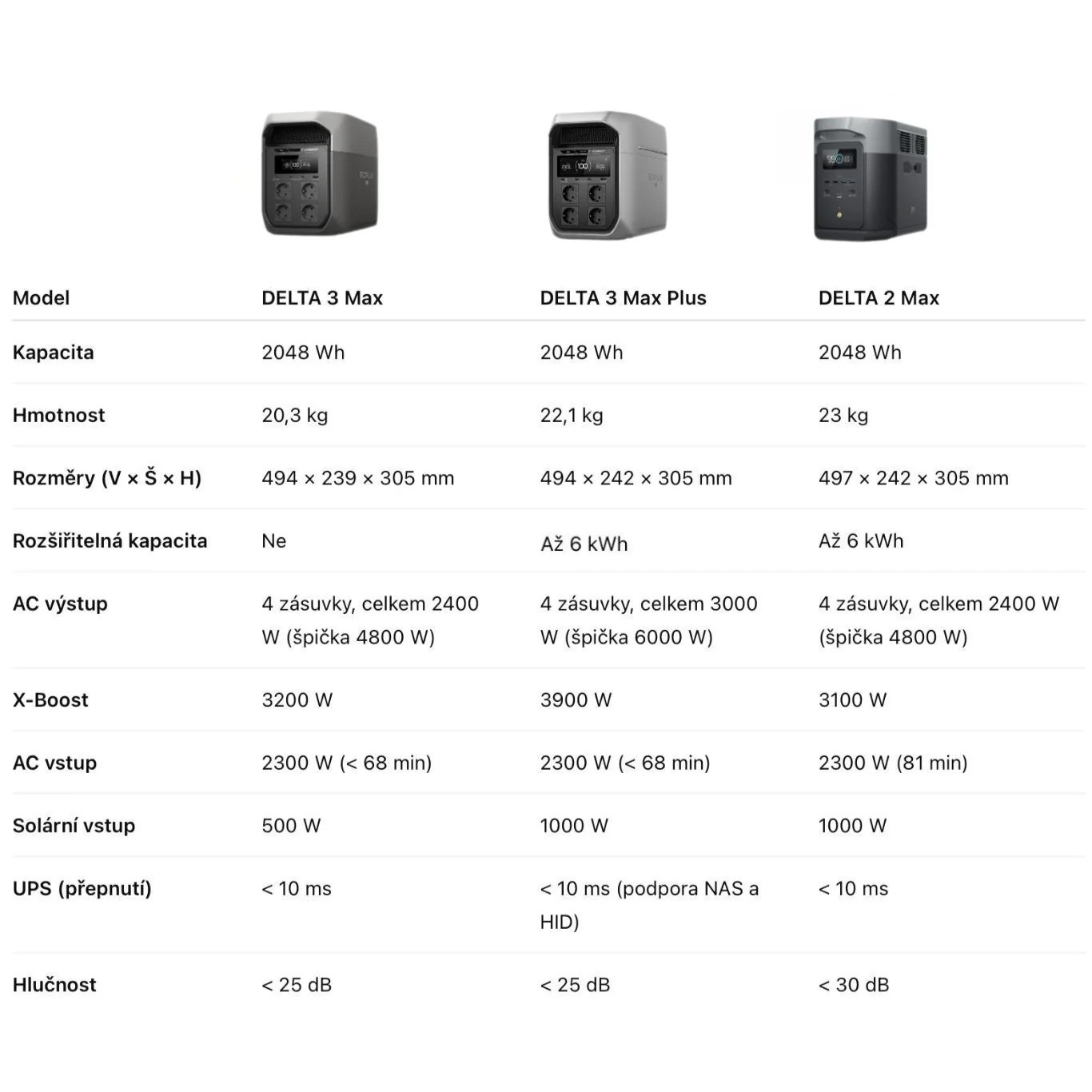 EcoFlow DELTA 3 Max Plus je bateriová stanice s akumulátorem LiFePO₄, základní kapacitou 2 048 Wh, která je rozšiřitelná přídavnými bateriemi až na 6 kWh. Má několik výstupů, včetně zásuvek střídavého proudu nebo portů USB-A a USB-C a je tedy připravena napájet domácí spotřebiče, včetně chladniček, televizorů a počítačů. Různé možnosti nabíjení umožňují využívat jednotlivé způsoby podle aktuálních potřeb. Stanice tedy představuje nejen velmi spolehlivý, ale zároveň i velmi flexibilní zdroj energie. Disponuje rovněž velmi prostorným displejem, který přehledně zobrazuje informace o aktuálních parametrech jejího provozu.