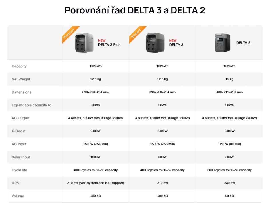 | Přídavná baterie: | rozšiřitelná kapacita do 5 kW, podporované: DELTA 2 MAX/DELTA 2/DELTA Pro3/DELTA 3 Extra Battery |