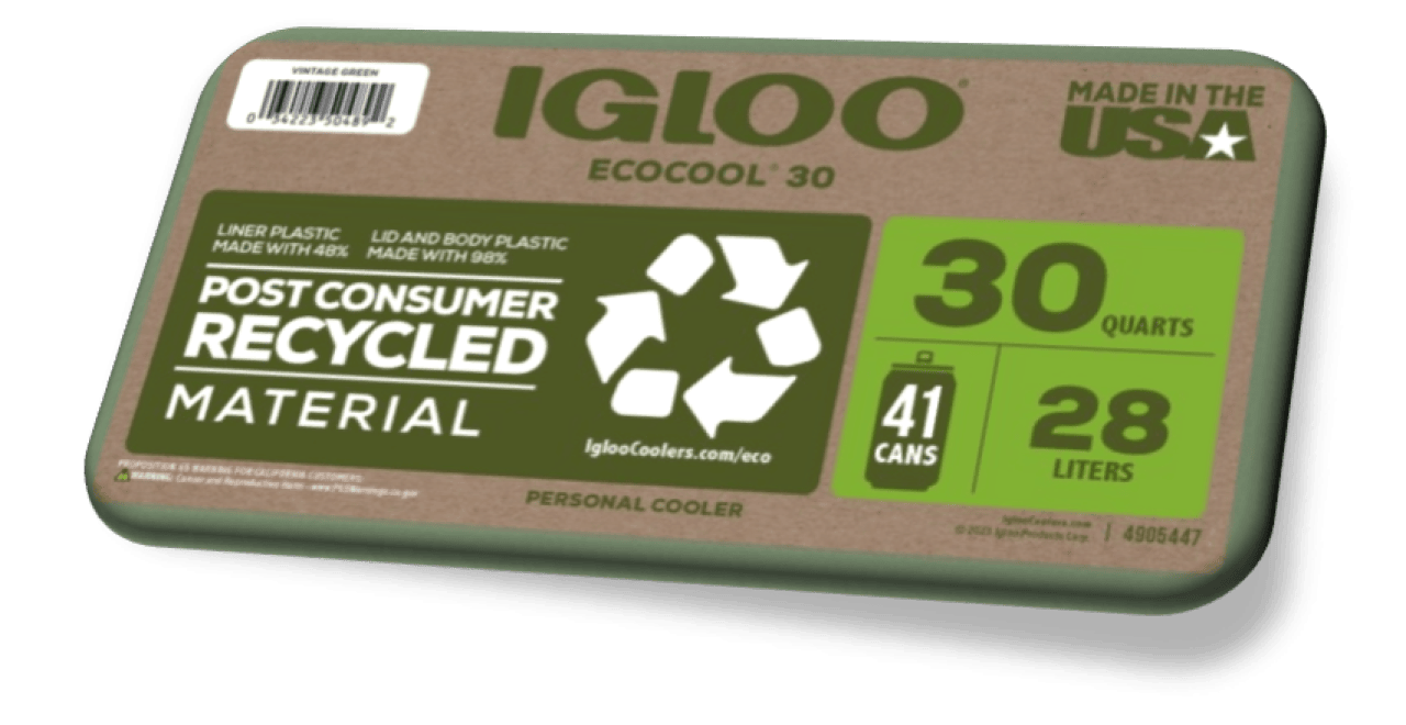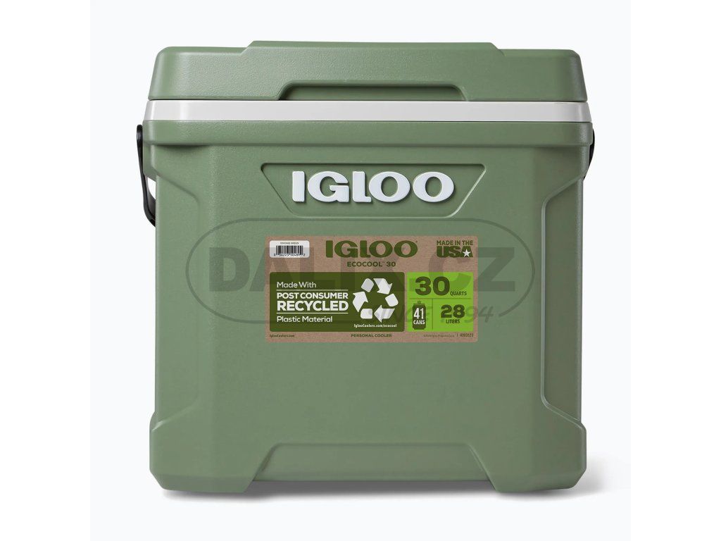 Pasivní chladicí box IGLOO ECOCOOL 30 - vnější obal, víko a vložka jsou vyrobeny z recyklované pryskyřice (PCR). Vše vyplněno čistší a ekologickou izolací THERMECOOL. Vyvýšený profil boxu pojme vyšší nápoje, jako jsou lahve vína, dvoulitrové lahve a sportovní nápoje. V ideální výšce poslouží box i jako pohodlné sedadlo. Výklopná rukojeť umožňuje snadné přenášení jednou rukou. Technologie Cool Riser Technology® minimalizuje kontakt s povrchem, což spolu s ekologickou izolační pěnou Thermecool™ zajišťuje vynikající chladicí výkon.