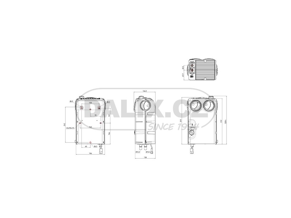 Vodní výměník Alizé provedení VI , robustní konstrukce. Výměník s regulací výkonu ventilátoru ve třech stupních, regulací teploty (ventilem), stavitelnými výdechy a výstupem pro rozvod vzduchu o Ø40 mm je určen do autobusů, obytných vozidel, lodí, karavanů, sanitních vozidel, kolejových vozidel, stavebních strojů, zemědělských strojů, apod.