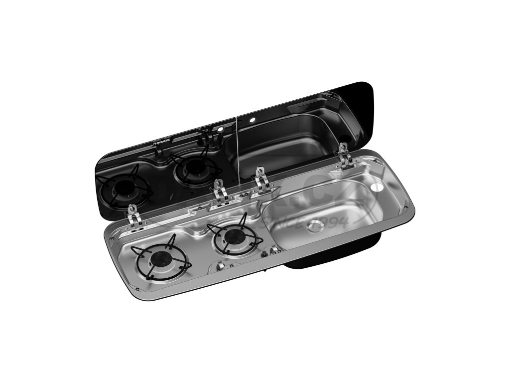 Praktická kombinace určená do malých prostor pro obytná vozidla a karavany, do kuchyně obytných automobilů, dodávek nebo přívěsů a pro lodní kuchyně. Dřez je umístěn vpravo od plynových hořáků. Skleněný kryt z tepelně odolného bezpečnostního skla se skládá ze 2 částí. Po zavření slouží jako pracovní plocha.