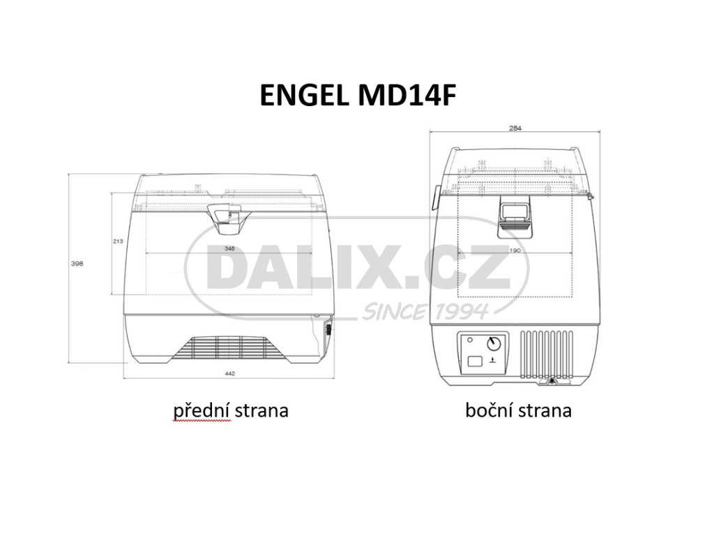 Kompresorová autolednička / automraznička ENGEL MD14F (little ENGEL) má novou generaci hermeticky uzavřeného Swingkompresoru Sawafuji s integrovanou řídící jednotkou, která zajišťuje plynulý rozběh kompresoru bez startovacích špiček a rázů. Nezávislost kompresoru na poloze - plný výkon lednice až do náklonu 60 stupňů. Velmi malá kompresorová autolednička, s uložením kompresoru ve vodorovné poloze, umožňuje maximální využití obestavěného prostoru. Lednice je vybavena vyvýšeným víkem s malými dvířky ve víku, eliminující tepelné ztráty při vkládání či kontrole vloženého zboží. Lednice je standardně vybavena popruhem pro jednoduchou manipulaci. Plynulé nastavení teploty je zabezpečeno otočným termostatem.