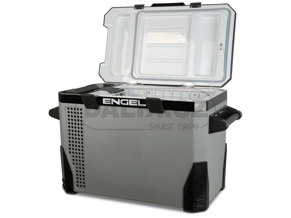 Kompresorová autolednička/automraznička ENGEL MR040 má hermeticky uzavřený Swing kompresor Sawafuji s integrovanou řídící jednotkou, která zajišťuje plynulý rozběh kompresoru bez startovacích špiček a rázů. Nezávislost kompresoru na poloze - plný výkon lednice až do náklonu 60 stupňů. Lednice má plynulou regulaci teploty otočným termostatem. Výparník je uložen po celém vnitřním obvodu lednice a není integrován do boxu. Lednice je vybavena madly pro snadnou manipulaci a oproti řadě MT je obal vyroben z odolného polypropylenu. Součástí dodávky jsou dva kabely na připojení ve vozidle s palubním napětím 12V nebo 24V a k hlavnímu síťovému napětí 230V. Uzávěr a panty jsou nerezové. Otevírání víka lze otočit o 180°. Do boxu lze vložit dvoulitrové láhve nastojato. Odolnost proti mechanickému poškození zvyšují robustní rohy s pryžovými prvky.