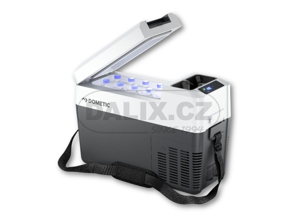Tento pozoruhodně lehký kompresorový chladící box je mimořádně kompaktní a snadno se používá. Mezi praktické funkce patří odnímatelný držák nápojů, zapuštěné rukojeti a ramenní popruh, jakož i integrované vodící prvky pro bezpečné upevnění uvnitř vozidla.