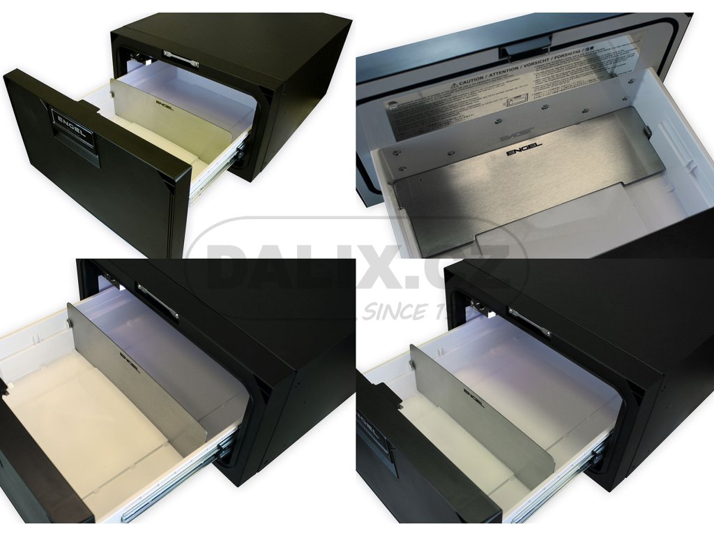Dělicí přepážka vnitřního prostoru zásuvky autolednice ENGEL SB30z broušeného nerezového plechu slouží např. k oddělení potravin a nápojů a to ve dvou volitelných vzdálenostech. V případě, že není přepážka využívána, lze ji vyjmout a uložit do přední části dna zásuvky. Přepážka není standardně součástí autolednice, jedná se o volitelné příslušenství.