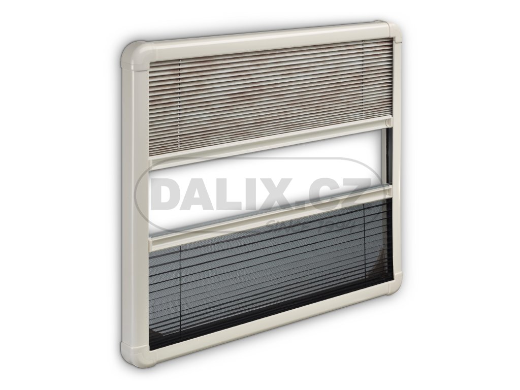 Rám pro okna série S7 s nastavitelnou clonou proti slunečnímu svitu a moskytiérou. Roletky lze sepnout k sobě a nastavit do libovolné polohy.