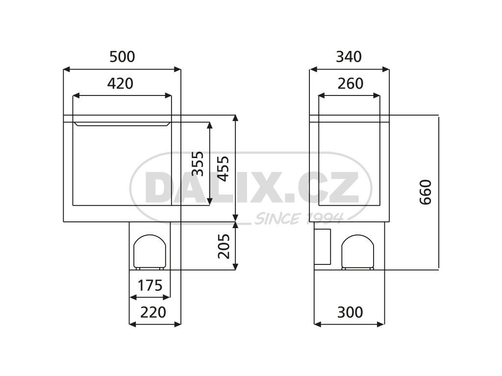 | Vnější rozměry v/š/h: | 660 / 340 / 500 mm |