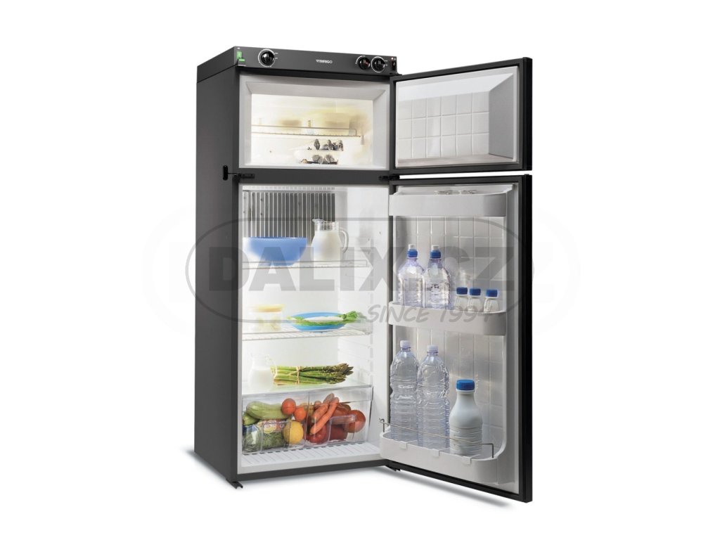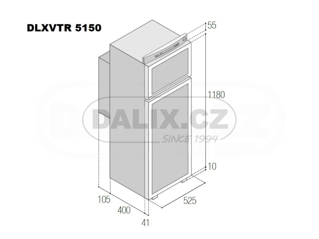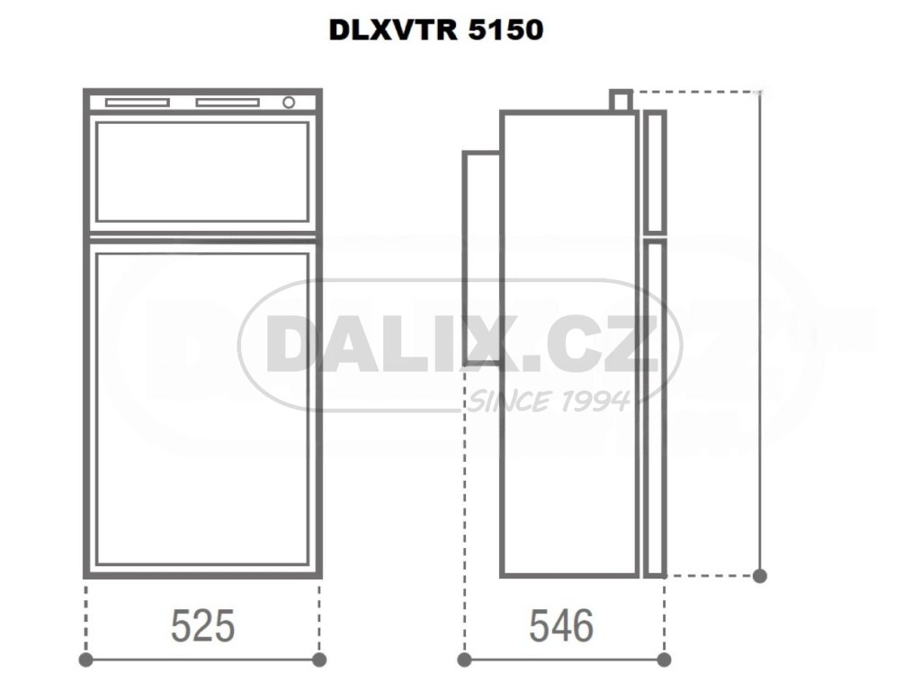 DLXVTR5150 je 2 - kombinace (dva zdroje energie) volně stojící klasické mobilní chladničky s vestavěným mrazicím boxem. Předností chladničky jsou dva volitelné zdroje energie (plyn nebo 230V AC) s 3-polohovým plynovým ventilem a ovládacím panelem pro řízení všech funkcí a tichý chod chladící aparatury. U chladničky je možné provést záměnu otevírání dveří a madla dveří. Chladnička je vybavena plynovým ventilem s bezpečnostním hlídačem plamene a termostatickou regulací obou energií. DLXVTR5150 nabízí dvě vyjímatelné police (chladnička) + jedna (mrazicí box) a 3 závěsné police na dveřích.